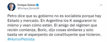 “Petro dice que su gobierno no es socialista porque hay Estado y mercado. En Argentina los K aseguraron lo mismo y vean cómo están. El amigo del régimen que recién comienza, Boric, dijo cosas similares y solo basta ver el esperpento de constituyente que hicieron. #HorrorPetrista”, afirmó Gómez en sus redes sociales.