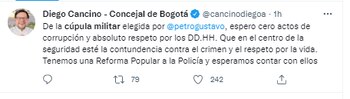 Una vez nombrada la nueva cúpula militar, las reacciones a los nombramientos no se hicieron esperar. El concejal de Bogotá Diego Cancino aseguró en sus redes sociales que: “De la cúpula militar elegida por Gustavo Petro, espero cero actos de corrupción y absoluto respeto por los DD.HH. Que en el centro de la seguridad esté la contundencia contra el crimen y el respeto por la vida. Tenemos una Reforma Popular a la Policía y esperamos contar con ellos”.