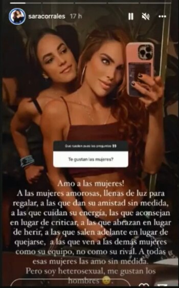 Y aunque en ese momento el interrogante de si es homosexual no quedó resuelto, en unas líneas posteriores al anterior mensaje, Sara Corrales, quien desmintió recientemente ser víctima de acoso por parte de Pablo Montero, aseguró que es heterosexual: “Me gustan los hombres”.