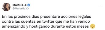 “En las próximos días presentaré acciones legales contra las cuentas en Twitter que me han venido amenazando y hostigando durante estos meses”, escribió Marbelle en sus redes sociales.