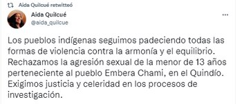 Una vez conocido los abusos de los que fue víctima la menor indígena, Aida Quilcué, senadora de la República por la Circunscripción Especial Indígena, condenó los hechos.