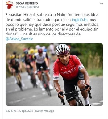 Desde el equipo no quisieron poner un reemplazo para la ronda de tres semanas, dejando claro que no pretenden hacer comentarios al respecto. Sin embargo, según puedo conocer el periodista y comentarista deportivo, Óscar ‘El Profe” Restrepo, el director deportivo del Arkea Samsic, Sebastien Hinault, habló sobre lo que viene pasando con Quintana tras el anuncio de la UCI: