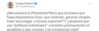 Sobre esto, Enrique Peñalosa respondió y afirmó que, “¿reconocerá el Presidente Petro que es bueno que haya empresarios ricos, que invierten, generan empleo, traen tecnología, e incluso exportan? Y ¿aceptará que sus “políticas industriales” consisten precisamente en ayudarles a que crezcan y se enriquezcan más?”.