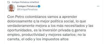 “Con Petro colombianos vamos a aprender dolorosamente q la mejor política social, lo que verdaderamente mejora a los más necesitados y las oportunidades, es la inversión privada q genera empleo, productividad y mejores salarios; no la carreta, el odio y los impuestos altos”, afirmó Enrique Peñalosa en sus redes sociales.