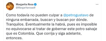 Margarita Rosa de Francisco hizo a un lado las críticas de la oposición y aseguró que, “como todavía no pueden culpar a Gustavo Petro de ninguna embarrada, buscan y buscan por dónde. Tranquilos. Eventualmente la habrá, pues es imposible no equivocarse al tratar de gobernar este potro salvaje que es Colombia. Que corrija y siga adelante, entonces”.