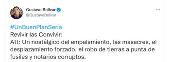 “#UnBuenPlanSería Revivir las Convivir: Att: Un nostálgico del empalamiento, las masacres, el desplazamiento forzado, el robo de tierras a punta de fusiles y notarios corruptos”, señaló el congresista Bolívar en su cuenta de Twitter.