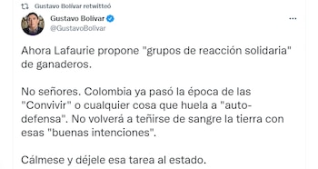 Esta no fue la única mención que realizó el senador Gustavo Bolívar a la propuesta realizada por el presidente de Fedegan, ya que también manifestó que, “Ahora Lafaurie propone “grupos de reacción solidaria” de ganaderos. No señores. Colombia ya pasó la época de las “Convivir” o cualquier cosa que huela a “auto-defensa”. No volverá a teñirse de sangre la tierra con esas “buenas intenciones”. Cálmese y déjele esa tarea al estado”.