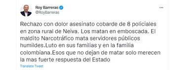 El presidente del Senado, Roy Barreras, también se manifestó a través de Twitter: