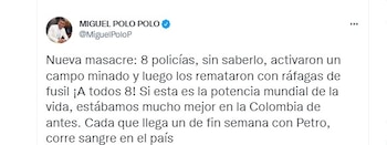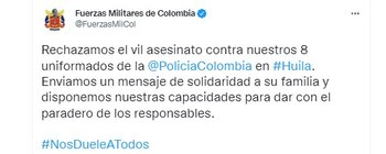 Por su parte, el mayor general Henry Armando Sanabria Cely, director de la Policía Nacional, también rechazó el ataque a sus subordinados. A través de Twitter escribió: