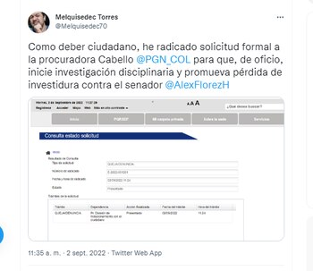 “Como deber ciudadano, he radicado solicitud formal a la procuradora Cabello para que, de oficio, inicie investigación disciplinaria y promueva pérdida de investidura contra el senador @AlexFlorezH”, informó el periodista en su cuenta de Twitter: