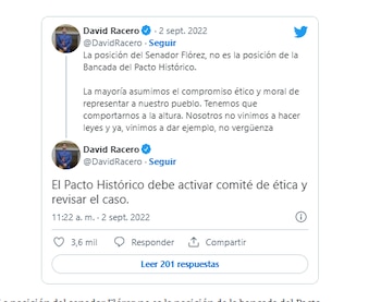 En un segundo trino, el presidente de la corporación aseguró que el partido de gobierno debe investigar a fondo lo sucedido: “El Pacto Histórico debe activar comité de ética y revisar el caso”, indicó.
