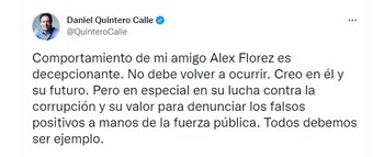 El mandatario local primero manifestó en sus redes sociales que el, “comportamiento de mi amigo Alex Flóprez es decepcionante. No debe volver a ocurrir. Creo en él y su futuro. Pero en especial en su lucha contra la corrupción y su valor para denunciar los falsos positivos a manos de la fuerza pública. Todos debemos ser ejemplo”. Sin embargo, después aseguró que, “los que esperan que deje sólo a Alex en este momento no me conocen. Fuerza Alex. #CreoEnAlex”.