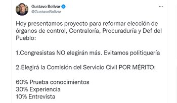 De acuerdo con el senador, se presentó el “proyecto para reformar elección de órganos de control, Contraloría, Procuraduría y Def del Pueblo: 1.Congresistas NO elegirán más. Evitamos politiquería 2.Elegirá la Comisión del Servicio Civil POR MÉRITO: 60% Prueba conocimientos - 30% Experiencia - 10% Entrevista”, manifestó en las redes sociales.