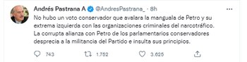El expresidente Andrés Pastrana también se sumó a las críticas por la decisión del conservatismo y en un trino dejó ver su inconformismo. “No hubo un voto conservador que avalara la manguala de Petro y su extrema izquierda con las organizaciones criminales del narcotráfico. La corrupta alianza con Petro de los parlamentarios conservadores desprecia a la militancia del partido e insulta sus principios”.