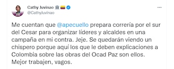 Por último la senadora Catherine Juvinao reveló en sus redes sociales que, “me cuentan que Ape Cuello prepara correría por el sur del Cesar para organizar líderes y alcaldes en una campaña en mi contra. Jeje. Se quedarán viendo un chispero porque aquí los que le deben explicaciones a Colombia sobre las obras del Ocad Paz son ellos. Mejor trabajen, vagos”.