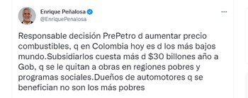 Sobre la decisión de incrementar el precio de la gasolina, el exalcalde Peñalosa, resaltó esta como “responsable” debido a que los subsidios en esta equivalen a 40 billones anuales. “Responsable decisión PrePetro de aumentar precio combustibles, q en Colombia hoy es d los más bajos mundo. Subsidiarlos cuesta más d $30 billones año a Gob, q se le quitan a obras en regiones pobres y programas sociales. Dueños de automotores q se benefician no son los más pobres”.