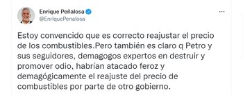 Sin embargo, Peñalosa se cuestionó sobre el comportamiento de los petristas en caso de que esta decisión hubiera sido tomada por otro gobierno, tal vez hubieran reaccionado de otra manera. “Estoy convencido que es correcto reajustar el precio de los combustibles. Pero también es claro q Petro y sus seguidores, demagogos expertos en destruir y promover odio, habrían atacado feroz y demagógicamente el reajuste del precio de combustibles por parte de otro gobierno”.