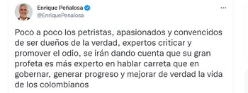 “Poco a poco los petristas, apasionados y convencidos de ser dueños de la verdad, expertos criticar y promover el odio, se irán dando cuenta que su gran profeta es más experto en hablar carreta que en gobernar, generar progreso y mejorar de verdad la vida de los colombianos”, afirmó Enrique Peñalosa en sus redes sociales.