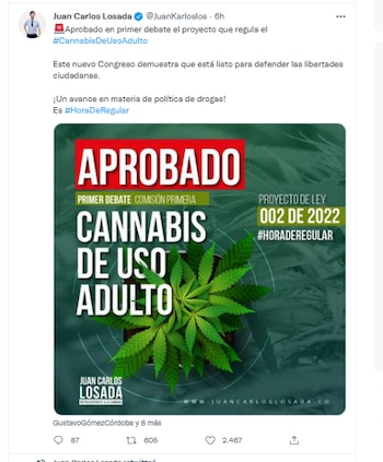 El congresista celebró este primer paso en su cuenta de Twitter. En la red social aseguró que le enviará una invitación formal al presidente Gustavo Petro para que el Gobierno se una a la discusión, “ya que a su cargo estará la regulación”.