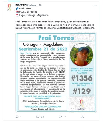 De acuerdo con el Instituto de Estudios para el Desarrollo y la Paz (Indepaz) con el homicidio de Frai Torres ya son 129 los líderes sociales asesinados en Colombia durante 2022. La cifra aumenta a 1.356 desde la firma del Acuerdo de Paz entre el Estado Colombiano y las extintas guerrillas de las Farc.