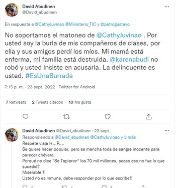 “No soportamos el matoneo de @CathyJuvinao. Por usted soy la burla de mis compañeros de clases, por ella y sus amigos perdí los míos. Mi mamá está enferma, mi familia está destruida. @karenabudi no robó y usted insiste en acusarla. La delincuente es usted. #EsUnaBurrada”, dijo David Abudinen.