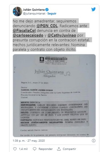 En cuanto al proceso que deberá continuar el abogado Julián Quintana, la revista Semana conoció que el letrado deberá presentarse ante la alta corte el próximo 4 de octubre para entregar más información sobre la denuncia interpuesta contra el gobernador del Magdalena y la representante a la Cámara por el Partido Alianza Verde.