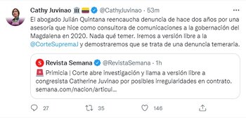 Tras conocerse la citación de la alta corte, Juvinao se pronunció a través de su cuenta de Twitter asegurando que no tiene “nada qué temer” por lo que presentará su versión libre ante la Corte Suprema de Justicia.