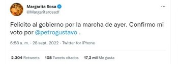 “Felicito al gobierno por la marcha de ayer. Confirmo mi voto por Gustavo Petro”, puso en su red social en donde suele emitir su opinión sobre varios temas. Ante eso varios fueron los comentarios en los que se unieron a sus palabras, pero por otro lado le refutaron, diciéndole: “Ya pasaron las elecciones. Ahora hay que ocuparse de lo público. De que gobiernen. Del equilibrio de poderes. No de un candidato”.