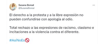 Ante esto, la representante a la Cámara, Susana Boreal, rechazó los comentarios realizados por la mujer que aparece en el video y afirmó que, “el derecho a la protesta y a la libre expresión no pueden confundirse con apología al odio. Total rechazo a las expresiones de racismo, clasismo e incitaciones a la violencia contra el diferente. #AsíNoEs”.