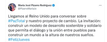 “Llegamos al Reino Unido para conversar sobre Paz Total y nuestro proyecto de cambio. La invitación: construir un modelo de desarrollo sostenible y solidario que permita el diálogo y la unión entre pueblos para construir un mundo a la altura de nuestros sueños”, afirmó la congresista Pizarro en sus redes sociales.