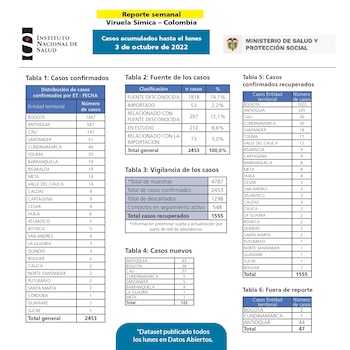 Si bien Colombia alcanzó 2.453 casos confirmados, los contagios nuevos del 27 de septiembre al 3 de octubre fueron 122. En Antioquia se presentaron 43 y en Bogotá 36. Los demás casos detectaron en los siguientes departamentos: Cali (27), Cundinamarca (5), Santander (5), Barranquilla (4), La Guajira (1) y Meta (1).