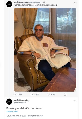 En una segunda publicación, como pie de foto, escribió “Ruanas colombianas con identidad mario Hernández (sic)” y replicó el tuit aclarando: “Ruana y midelo Colombiano (sic)”.