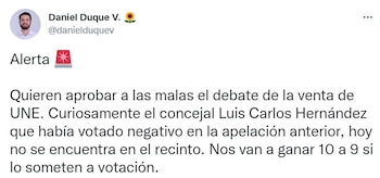 El punto es que la solicitud se hizo, según la oposición, luego de que el concejal del Partido de La U, Luis Carlos Hernández Castro, se retirara del recinto. Es de resaltar que este cabildante es uno de los que se opone al proyecto y en su ausencia, la votación probablemente hubiera resultado a favor de la venta.
