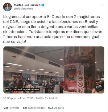 “Llegamos al aeropuerto El Dorado con 2 magistrados del CNE, luego de asistir a las elecciones en Brasil y migración está llena de gente pero varias ventanillas sin atención. Turistas extranjeros me dicen que llevan 2 horas haciendo una cola que se ha demorado igual que su viaje!”, trinó la excanciller y exvicepresidenta colombiana.