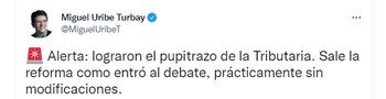 La reforma tributaria fue el primer proyecto presentado por el gobierno de Gustavo Petro a través del Ministerio de Hacienda y el jefe de cartera, José Antonio Ocampo, no obstante esta forma de recaudo fue criticada y cuestionada por la oposición. Miguel Uribe fue uno de los congresistas que más veces manifestó su preocupación por este proyecto de ley. La tributaria, fue presentada el martes en la noche y el jueves fue debatida, siendo aprobada ese mismo día. El legislador consideró que esto fue un “pupitrazo”