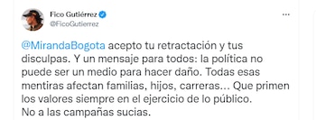 El excandidato presidencial, Federico Gutiérrez respondió al mensaje de la parlamentaria y afirmó que, “Katherine Miranda acepto tu retractación y tus disculpas. Y un mensaje para todos: la política no puede ser un medio para hacer daño. Todas esas mentiras afectan familias, hijos, carreras... Que primen los valores siempre en el ejercicio de lo público. No a las campañas sucias”.