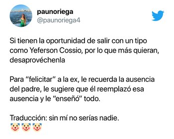 La publicación ha recibido muchísimas reacciones -no todas negativas, como la de Diana Celis, quien aplaudió al paisa- y el nombre de Yeferson Cossio se hizo tendencia en Twitter. “Si tienen la oportunidad de salir con un tipo como Yeferson Cossio, por lo que más quieran, desaprovéchenla”, se lee en algunas publicaciones.