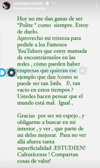 Tal y como sucedió el pasado viernes, cuando compartió en Instagram una publicación con la cual hizo un fuerte llamado a todos aquellos creadores de contenido digital que se han vuelto “ejemplo” para quienes los ven.