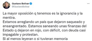 “La mayor oposición q tenemos es la ignorancia y la mentira. Estamos arreglando un país que dejaron saqueado y ensangrentado. Estamos saneando unas finanzas del Estado q dejaron en rojo, con déficit, con deuda casi impagable y protestan. Si al menos leyeran o si tuvieran memoria”.