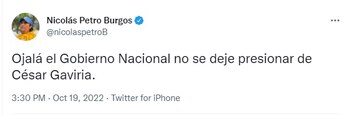 “Que no se deje presionar de nadie Nicolás, el pueblo solo observa y será el mejor aliado de @petrogustavo que no lo olvide”, “@CesarGaviriaOf es el representante de la politiquería colombiana, sin principios ni palabra, lo mueven intereses personales y no es confiable, es todo lo que está mal en la política tradicional” y “César Gaviria es otro cáncer y sida de Colombia estos políticos corruptos aliados al uribismo son los que tienen a Colombia desangrando”, fueron algunos de los comentarios que recibió Nicolás Petro en apoyo a su publicación.