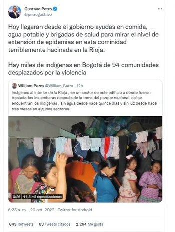 El presidente Gustavo Petro ha anunciado a través de su cuenta de Twitter que brindará ayudas a las comunidades indígenas que permanecen en Bogotá desde hace meses y que fueron reubicados luego de que se radicaran por 8 meses en el Parque Nacional al oriente de la capital.
