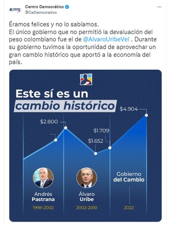 El mensaje estuvo acompañado de una infografía comparando el precio de dólar en un rango de 20 años. En la pieza gráfica, el partido de derecha muestra que Álvaro Uribe Vélez, cuando asumió la Presidencia de la República, recibió de Andrés Pastrana el dólar a 2.800 pesos.