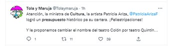 Lo mismo hicieron Tola y Maruja: “Atención, la ministra de Cultura, la artista Patricia Ariza, logró un presupuesto histórico pa su cartera. ¡Feliestripaciones! Y le proponemos cambiar el nombre del teatro Colón por teatro Quintín...”, trinaron.