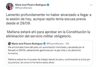 Y agregó, “lamento profundamente no haber alcanzado a llegar a la sesión de hoy, aunque repito tenía excusa previa desde el 29/09. Mañana estaré ahí para aprobar en la Constitución la eliminación del servicio militar obligatorio”.