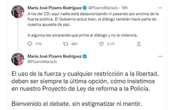 “A los del CD: aquí nadie está desautorizando ni pasando por encima de la fuerza pública. El Gobierno actuó bien, el diálogo también hace parte de nuestra apuesta de paz. A algunos les sorprende que prime el diálogo y no la violencia”, afirmó la congresista en sus redes sociales
