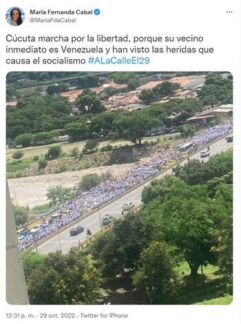 La senadora del Centro Democrático, María Fernanda Cabal, salió este fin de semana a las calles para manifestarse contra el gobierno actual liderado por Gustavo Petro, quien en este momento es una de las principales caras de la oposición en Colombia uso sus redes sociales para enviar mensajes sobre su postura y criticas al gobierno, una de esa fue de la supuesta marcha que se hizo en Cúcuta; sin embargo, en redes varios usuarios salieron a desmentirla y aseguraron que se trata de una imagen del concierto en la frontera el 22 de febrero de 2019.