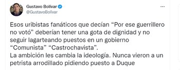 “Esos uribistas fanáticos que decían “Por ese guerrillero no votó” deberían tener una gota de dignidad y no seguir lagarteando puestos en un gobierno “Comunista” “Castrochavista”. La ambición les cambia la ideología. Nunca vieron a un petrista arrodillado pidiendo puesto a Duque”, aseguró Gustavo Bolívar hace algunos días en sus redes sociales.