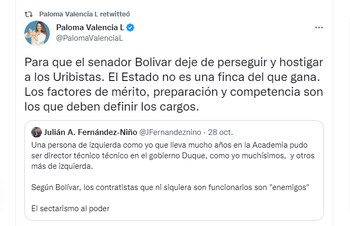 Sobre esto, la senadora Paloma Valencia compartió el comentario en sus redes sociales y aprovechó también para enviarle un mensaje al congresista del Pacto Histórico. “Para que el senador Bolívar deje de perseguir y hostigar a los Uribistas. El Estado no es una finca del que gana. Los factores de mérito, preparación y competencia son los que deben definir los cargos”.