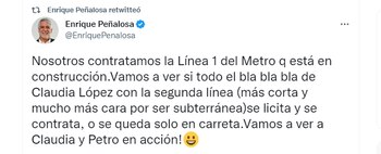 “Nosotros contratamos la Línea 1 del Metro q está en construcción.Vamos a ver si todo el bla bla bla de Claudia López con la segunda línea (más corta y mucho más cara por ser subterránea)se licita y se contrata, o se queda solo en carreta.Vamos a ver a Claudia y Petro en acción!”, afirmó Peñalosa en sus redes sociales.