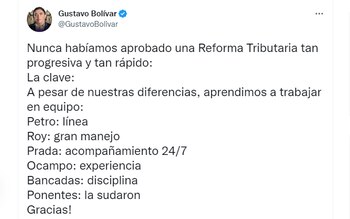 “Nunca habíamos aprobado una Reforma Tributaria tan progresiva y tan rápido: La clave: A pesar de nuestras diferencias, aprendimos a trabajar en equipo: Petro: línea, Roy: gran manejo, Prada: acompañamiento 24/7, Ocampo: experiencia, Bancadas: disciplina, Ponentes: la sudaron, Gracias!”, afirmó.